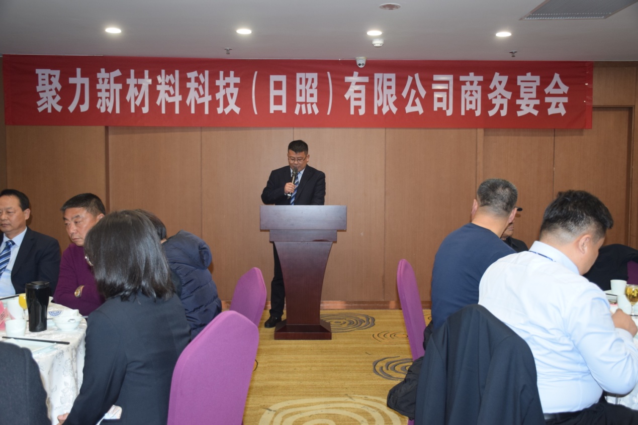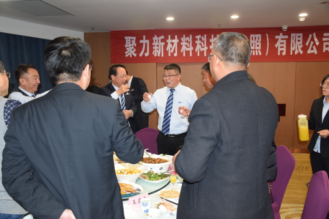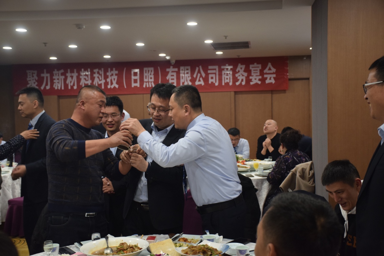 古人云“有朋自遠方來,不亦樂乎”,12日晚,公司在日照君臨天下大酒店舉行了隆重的歡迎晚宴。宴會上來自江蘇、山東兩地的客商與公司高管及業務團隊推杯換盞,觥籌交錯,公司常務副總陳玉剛代表公司致歡迎詞,對百忙之中撥冗蒞臨聚力新材料科技(日照)有限公司商務宴會的客商表示親切的問候和熱烈的歡迎! 并對所有關心、支持山東聚力集團發展的各界朋友致以崇高的敬意!